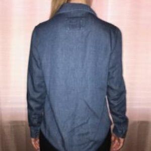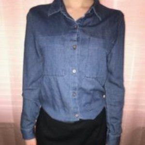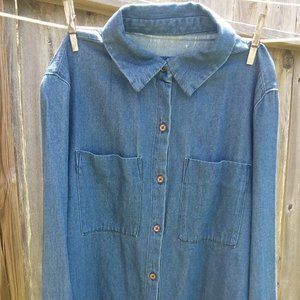 A long button down shirt that can also serve as a tunic. Bright blue. Made of a cotton/rayon blend. Not much stretch. Excellent condition.