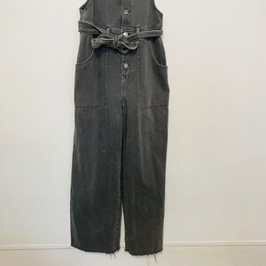 Denim Button Front Belted Gray Wide Leg Overalls Jumpsuit