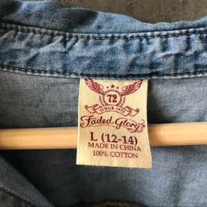 Denim Faded Glory button up with cute frayed hem. Tuck it in, tie it up, or layer it for a casual look.