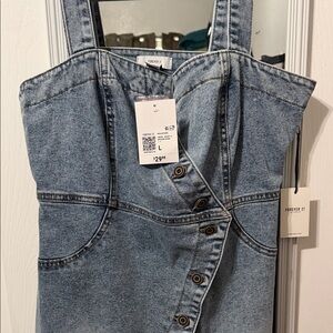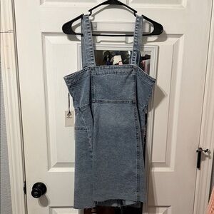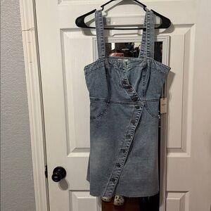 Stylish asymmetrical denim dress. Features button details and adjustable straps. Perfect for casual outings.