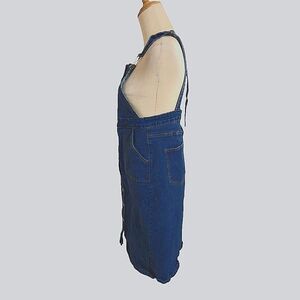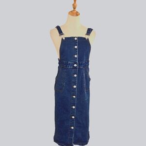 This is a denim overall dress, but longer It's got that cool, classic blue jean vibe, and it buttons all the way down the front with shiny white buttons.