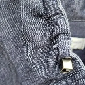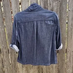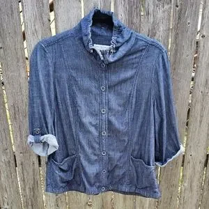 Lightweight jacket with 3"ruffle collar. Button-front closure and rolled sleeves. Front patch pockets. Missing the waist cord. Casual, versatile layer for everyday wear. This is a really cute and versatile piece to add to your wardrobe; I'd keep it if it fit me.