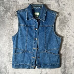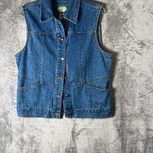 Stylish denim vest with button-up front. Features classic stitching and pockets.