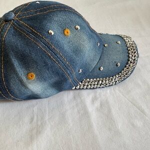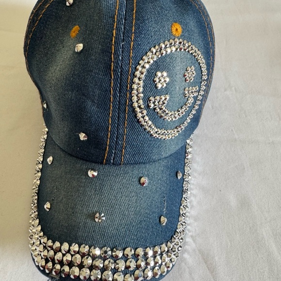 Stylish denim cap featuring a rhinestone smiley face. Embellished with sparkling rhinestones for a trendy look.