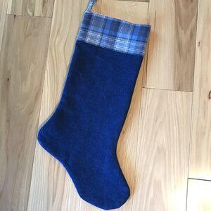 Denim Christmas stocking with cuff made from blue and gray flannel and the words "Joy to the World"" appliqued on the front with silver vinyl. This beautiful medium to large-sized old-fashioned stocking would look great with your western, country farmhouse theme or rustic holiday décor. It is made from repurposed jeans and a plaid shirt and would also make a nice sustainable Christmas gift!