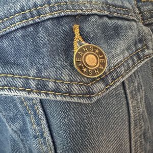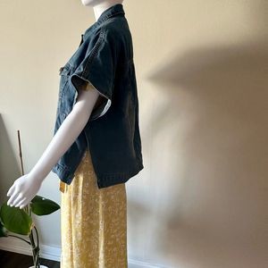Women’s cropped denim cloak/cap sleeve jacket with open sides features a fold over collar, poncho side slit sleeves, button flap chest pockets, button down front closure, and a cropped silhouette, 100% cotton, size small