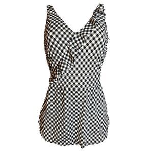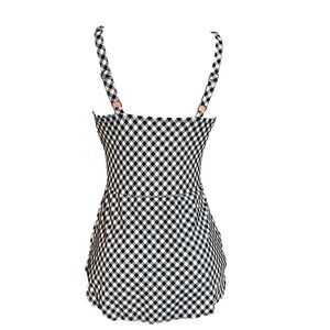 Features: one-piece, ruffle trim, side-seam shirring, adjustable straps, front and back curved bottom skirt hem overlay, elastic leg openings