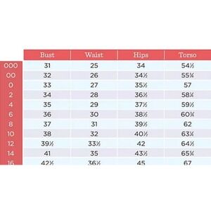 Fit: 8 fits bust 37", waist 31", hip 39-1/2"; 20W fits bust 46-1/2", waist 41-1/2", hip 49"