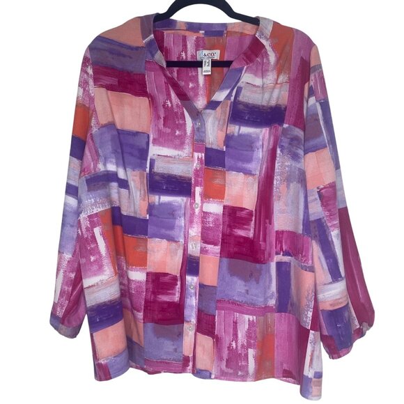 Denim & Co. Button Up Top Womens 1X Pink Blouse 3/4 Sleeves Plus Size Artsy Casu