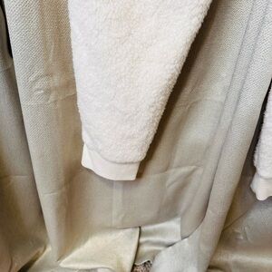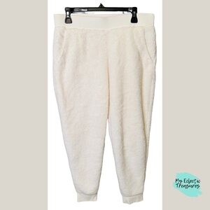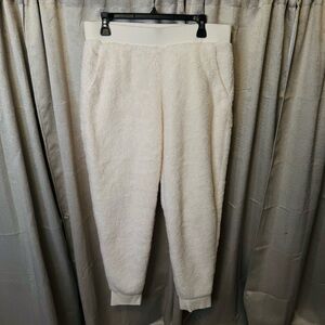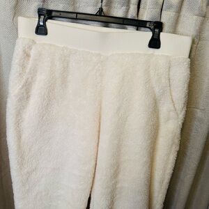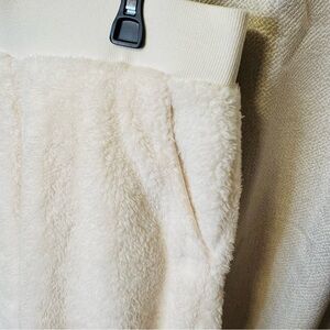 These medium lounge pants in a soft cream hue are crafted from a textured faux fur fabric, offering a cozy and stylish option for casual wear. With a high-waisted design and a relaxed fit through the hips and thighs, they taper towards the ankles for a sleek silhouette. Perfect for laid-back days, these lounge pants blend comfort with a modern aesthetic. Made of 100% polyester. Inseam 29 inches. Waist measurement 36 inches. A large could also enjoy these.