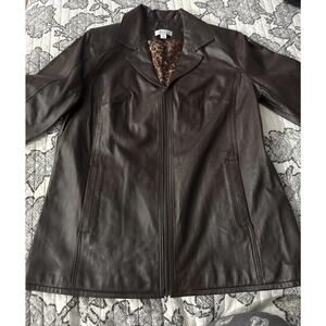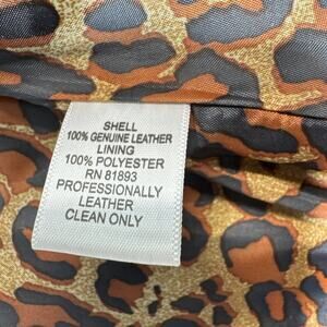 The Denim & Co D&CO Leather Ladies Brown Motorcycle Jacket in size M is a stylish and versatile outerwear piece for women. Made from high-quality lamb leather with a leopard print satin lining, this jacket features a zipper closure and a wing collar style. The casual occasion and motorcycle jacket style make it a fashionable choice for everyday wear. The brand Denim & Co ensures the quality and authenticity of this piece, making it a must-have addition to any woman's wardrobe.