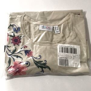 Features: placed embroidery at front body, scoop neckline, 3/4-length sleeves, slight shirring at sleeve cap, straight hem