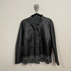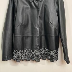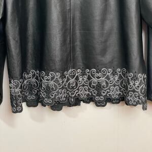 Details: long sleeve genuine leather jacket button snap closure with cottagecore bohemian embroidered scallop hemline gorgeous!! Collared