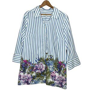 Denim & Co. Large L Blue Striped Tropical Border Print Button Front Tunic Top