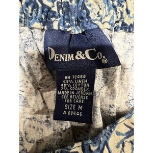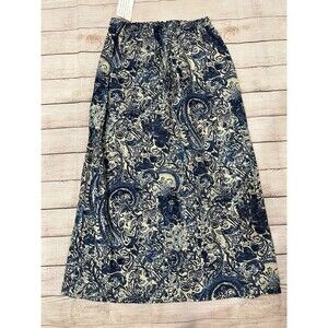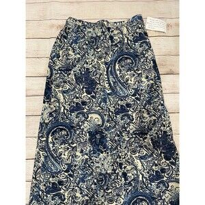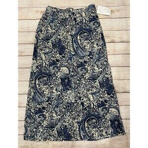 The Denim & Co. Linen Blend Midi Skirt is a stylish and versatile piece perfect for any season. The paisley print adds a touch of charm to this A-Line skirt, while the spandex, linen, and cotton material ensures comfort and breathability. With a pull-on closure and elastic waist, this skirt is easy to wear and easy to style. The medium size and midi length make it a flattering fit for any woman looking to add a pop of color to her wardrobe. 28 inch elastic back waist and 36 inches long. Smoke free home.