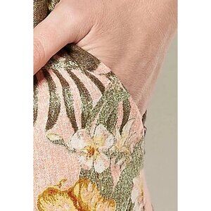 Fabrication: wovenFeatures: pull-on style, elastic waistband, turnback hemRise: slightly below the waistFit: semi-fitted; follows the lines of the body with added wearing easeLeg Shape: straight leg; falls straight from knee to leg openingInseam: missy/plus inseam 7"Content: 55% linen/45% viscoseCare: machine wash, tumble dryImported