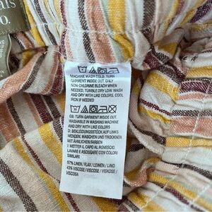 These Denim & Co linen blend pants are so cute. They feature yellow, maroon, cream, and brown stripes, along with side slit pockets, elastic waistband, drawstring waist, and wide legs. They are in like new condition.