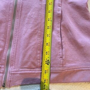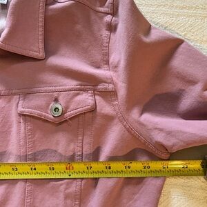 Excellent condition Medium pink, bubblegum pink, soft stretchy cotton Zip front, silver buttons, front pockets, ribbed cuffs, collar, seamed body Utility, denim style jacket, jean jacket, casual, comfortable, stretch denim Size Large Lay flat chest 21” Length 26” 96% Cotton 4% Elastane Machine wash cold, tumble dry low Thanks for shopping my closet! Offers and questions welcomed.