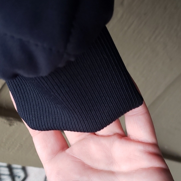 Features: diagonal quilted design, rib trim at collar, long sleeves, shirring at cuffs, curved hemline