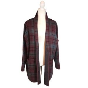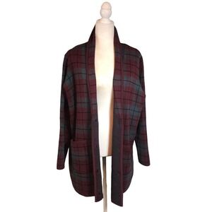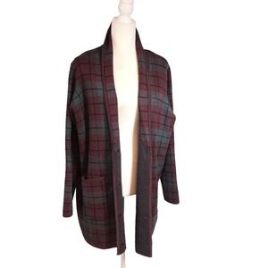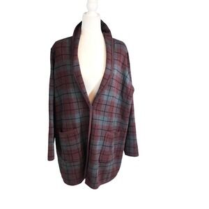 Denim & Co Shacket Women’s 1X Burgundy Gray Box Tartan Plaid Cotton Knit Open