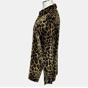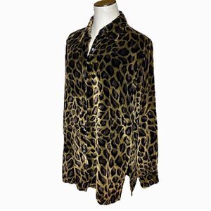 Denim & Co. Velvet Leopard Print Button Down Shirt The Denim & Co. Leopard Button-Down Shirt is a bold and stylish piece, perfect for adding a pop of print to your wardrobe. Made from soft, breathable fabric, this shirt features an all-over leopard print in neutral tones, offering both comfort and standout appeal. The button-down design includes a classic collar, long sleeves with buttoned cuffs, high side slits for a flattering, relaxed fit. Ideal for layering or wearing on its own, this versatile shirt can be dressed up with tailored pants or worn casually with jeans for an effortlessly chic look. 1X