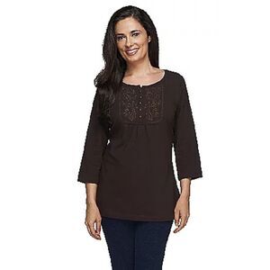 Denim & Co Womens 3X Perfect Jersey 3/4 Sleeve Tunic Top Cranberry Embroidered NWT