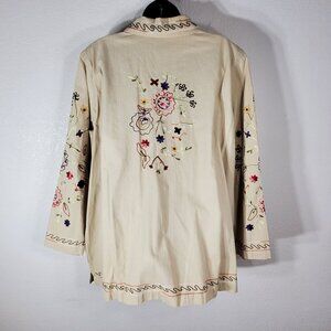 Denim & Co. Womens Beige Embroidered Button Shirt Jacket 1X Floral Long Sleeve