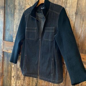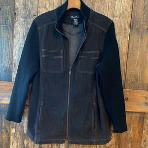 Fabulous outdoor barn shacket. Hiking, camping, outdoor activities. The body is denim, the sleeves and collar are a nice chunky sweater fabric.