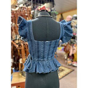 Reposh but is still new w tags. It’s just a little too big for me as I lost weight. Elevate your style with this chic denim corset top. Featuring elegant ruffle sleeves and a flattering fit, this top is perfect for any occasion. The classic blue denim color adds a timeless touch to your wardrobe.