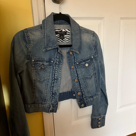 White House Black Market Crop Denim Jacket with ruffle down front. Two small Crysals on front pockets.