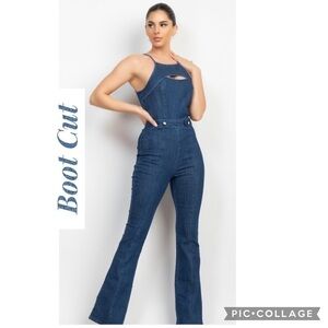 Dark Denim Jumpsuit…Peek-a-boo opening @ upper chest. Spaghetti straps & silver decorative buttons. Razor back-Full Zipper in back. Boot cut. True to size. 63% Cotton, 32% Poly, 3% Rayon, & 2% Spandex. So CUTE!!