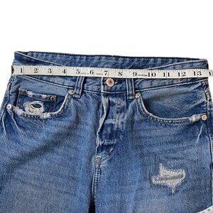 These jeans from &Denim are in excellent preowned condition. They are a light wash 100% cotton fabric.The jeans are button fly and have a wonderful destroyed look on the front with some distress on the back pockets. Tag is marked as a boyfriend with low waist style. Measurements included in photos.