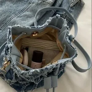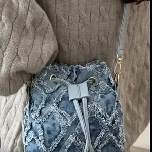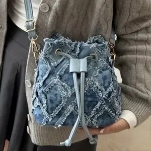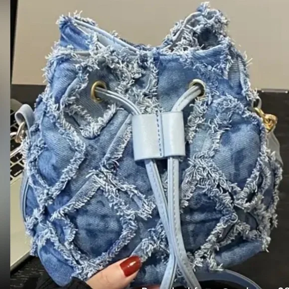 Stylish denim drawstring backpack with a unique frayed design. Perfect for casual outings.
