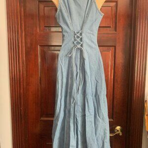 True vintage denim dress. Gives 90's vibes. Excellent condition. Fabric is 100% denim, no stretch. Narrow through hips. Length is mid-calf.