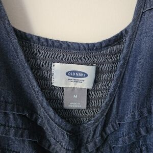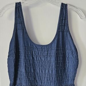 Sleeveless dark denim dress with side zipper. Super flattering fit!
