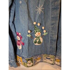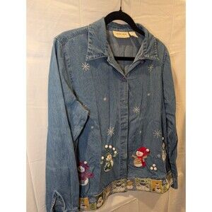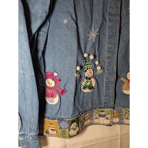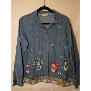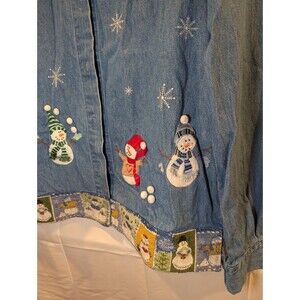 Denim Embroidered Snowman Shirt With Woven Trim Size Small Teacher Christmas