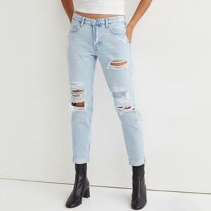 Blue jeans by &Denim in factory distressed denim of 100% cotton are a boyfriend fit with a low-medium rise, button fly, and 5-pocket detailing. Straight, regular length legs are designed to fall at the top of the ankle with little or no stacking. The pair you'll return to again and again. Excellent condition.