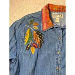 Vintage denim button front shirt with plaid accents and embroidered leaves