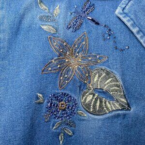 Denim Floral Embroidered Beaded Button Shirt Cottagecore Grandmacore GoldenGirls