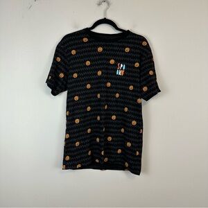 New with tags black and gray patterned t-shirt with jack o'lantern pumpkins printed throughout, and "spooky" on the front.