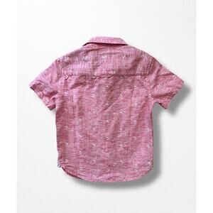 Woven salmon-colored short sleeve button down shirt from Denim & Flower in kids’ size 4. Features a tiny palm trees print, white and navy striped accents, and is 60% cotton/40% lyocell. In excellent pre-owned condition.