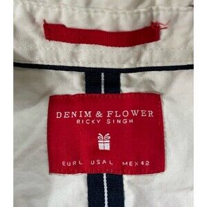 This Denim Flower Button Up Shirt for men in size L features a white color with a Santa Claus Christmas theme, perfect for the holiday season. Made of lightweight and breathable cotton fabric, this shirt is easy to care for and features a classic collared neckline with a button-down style. The shirt is suitable for various occasions including parties, casual outings, and workwear, and is adorned with a graphic print pattern that adds a festive touch to the design. Perfect for the winter, fall, and spring seasons, this shirt is a stylish and comfortable addition to any man's wardrobe.