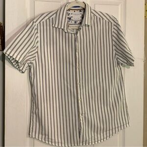 The Denim & Flower Button Up Shirt in Men's size Large features a white background with blue and gold stripes, making it a stylish and versatile addition to any wardrobe. Made from cotton and machine washable, this short sleeve shirt is perfect for casual wear, work, or travel. The classic collared neckline, button closure, and regular fit make it a timeless piece that can be worn year-round. Perfect for layering in warmer months or by itself in cooler weather, this button-up shirt by Denim & Flower is a must-have for any man's closet. SKU x2