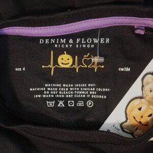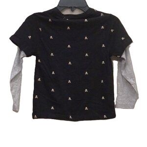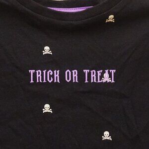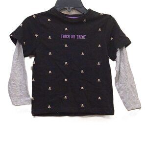 Denim & Flower Tee. Faux Layer Tee Long Sleeve Gray Under Black Short Sleeve Tee with White Skeleton Pattern and Trick or Treat in Purple on Front. Halloween. 100% Cotton. Boy’s Size 4. New with Tags.