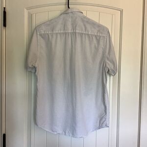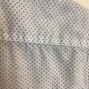 Lightweight Men's button down in beautiful blue print with dark navy paisley accent to sleeves and interior neck. Size Medium.