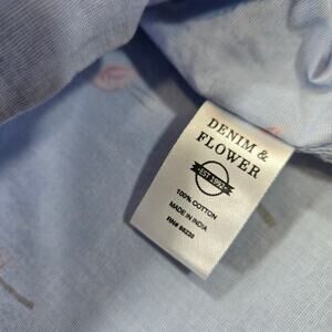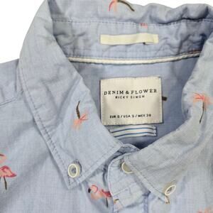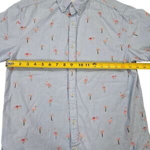 Denim & Flower Mens SM Short Sleeve Button Up Shirt Flamingo Palm Tree Tropical Cruise Vacation Travel Trip Comfort School College Teen Young Adult Wedding Party Luau Guest Spring Summer Pool Party 100% Cotton. Measurements as shown in photos.