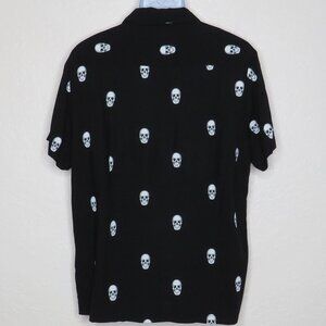 Pre-Owned Condition! 100% Viscose. Awesome Black Button Down Shirt with Graphic Skulls Print and Matching Glossy Black Buttons(spare attached). Very Soft!