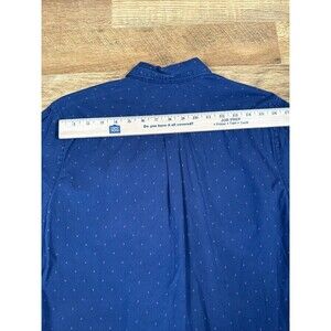 Denim & Flower Ricky Singh Button Up Shirt Faded Dark Blue with All Over Little Red Anchors Mens Size Large. Cuff sleeves fold up to show floral / stripe prints. The first photos of the shirt hanging are the actual color. The photos taken laying flat for measurements make it appear darker than it is. The color is a faded dark blue.
