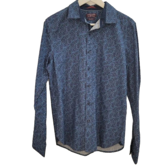 Look downright dapper in this fantastic floral button-down shirt by Denim & Flower, Ricky Singh. Long-sleeve with attractive blue and purple floral pattern. Size small, slim fit for a tailored look and feel.