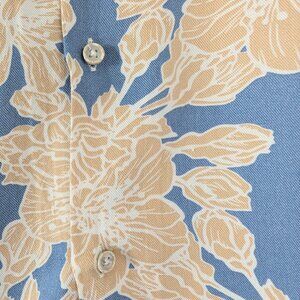 Men's short sleeve camp collar Hawaiian shirt with cornflower blue and butter yellow floral print. Open placket with textured buttons. Lightweight and comfortable. Smooth and cooling feel.